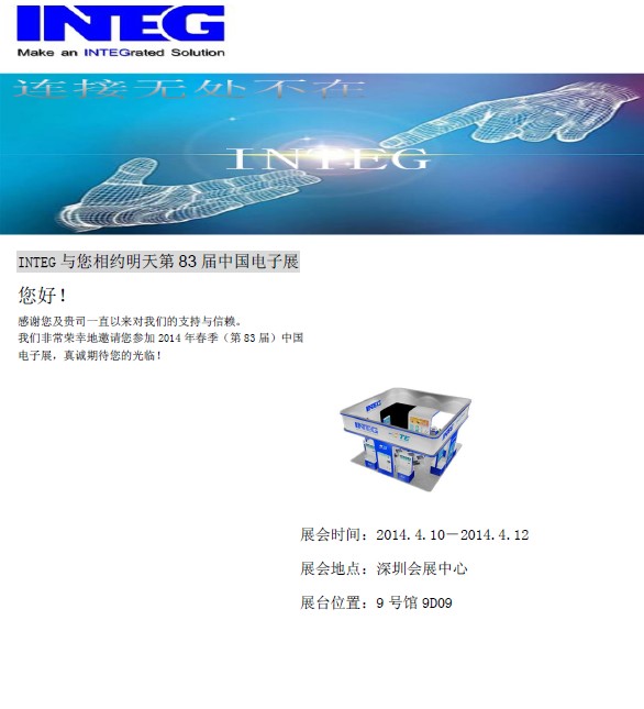 尊敬的客户,感谢您一直以来对NG大舞台的支持, 我司参加了83届中国电子展, 届时将展示我司的所代理的产品线和最新的连接解决方案,我司展位在深圳会展中心, 9号馆 9D09, 参展时间是4月10日至12日,